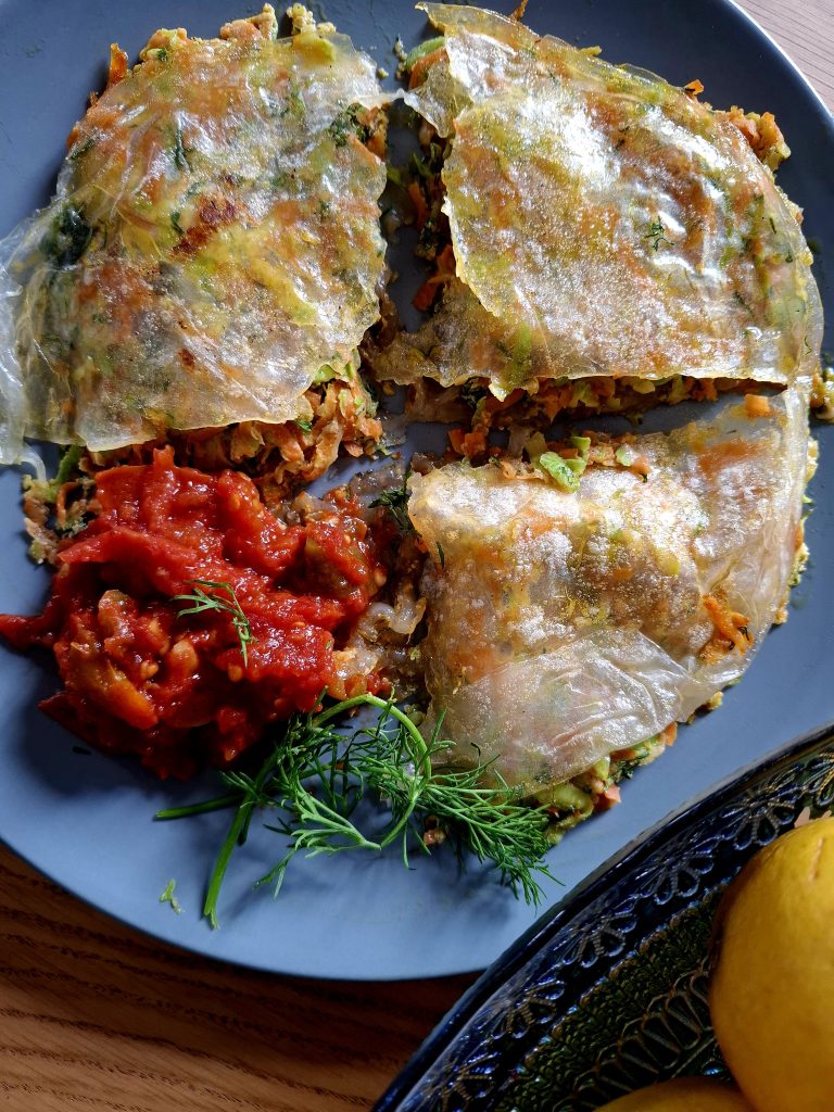 עליהם נשים את התערובת ביצה והירקות שהתקבלה ומעל 2 דפים נוספים.